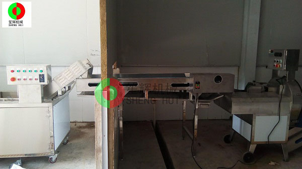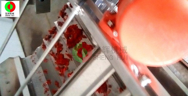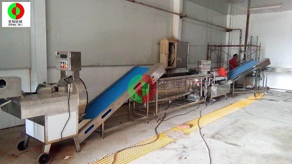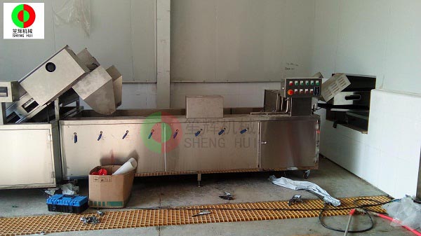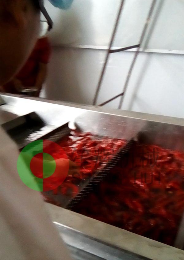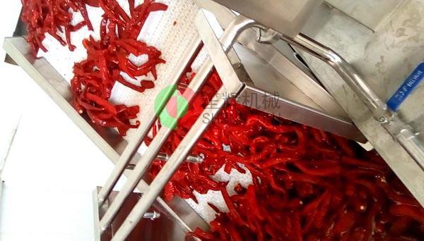 山東德州的YC公司是位于當地一家大型辣椒加工產業基地內,該辣椒城是一個集辣椒收購、儲存、加工、銷售、科研于一體的綜合性專業市場,擁有交易區、倉儲區、加工區、服務區等多功能區,年成交量7.5億斤,成交額10億元,是山東省辣椒專業市場,也是江北大的辣椒深加工基地。YC公司在本公司非標定制的這條生產線,從辣椒的解凍開始,經我們的QX32氣泡洗菜機切割前清洗,后平面輸送到SH-165大型切菜機切割成段,然后用皮帶提升機提升到渦流洗菜機深度清洗,震動瀝水除雜后再次輸送到SH-165大型切菜機進行深度切碎,最后成品!客戶這個項目的開展,很好地解決了之前人工作業,生產成本高的老大難問題,勢必能在其提高生產能力,節省生產經營成本等方面起到作用。