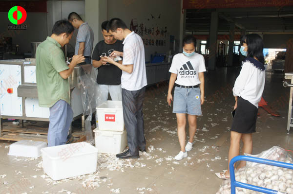 知名企業客戶考察公司現場,并測試大蒜加工生產設備!某知名企業派遣人員到我司進行考察,測試大蒜加工生產設備。客戶對大蒜的加工生產中,需要對大蒜進行分瓣與脫皮實現機械化流水性生產,以減少對人力勞作的依賴,并增加產能!客戶技術人員對設備的各項指標進行了認真細致的考察.