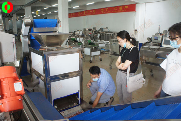惠州客戶王小姐親臨我司測(cè)試洋蔥脫皮及切碎設(shè)備!