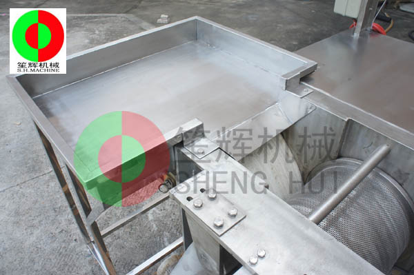 魚肉提取機的工作原理:人工把待加工的魚先去掉魚頭和取出魚肚中的內臟;對大魚,則需將魚剖分成兩半,漂洗干凈(避免采出來的魚漿被內臟及魚血污染)。隨后將魚片投入到料斗內(魚的剖分面朝向采取筒,背部貼近橡膠帶),魚在橡膠帶的帶動下進入采取筒與橡膠帶的擠壓區,在橡膠帶與采取筒之間的擠壓力的作用下,魚肉被擠壓通過采取筒上的小孔進入采取筒內,采取筒內的魚肉碎粒會隨著旋轉自動送出。而魚皮及魚刺等雜物則被裝在機器上的刮刀從采取筒外延上刮下落在收集槽中。整個采肉分離過程無需人手操作,衛*生。橡膠帶與采取筒之間的壓力大小,是由位于機器頭部的橡膠帶拉緊裝置調節。調節量的大小可根據魚種的大小靈活調整。提取出來的魚肉可作為魚丸、魚漿,魚醬,魚肉餅,魚餡餃等等食品原料,大大提高魚類經濟價值。