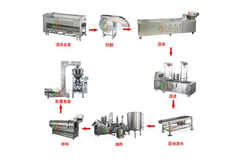 油炸薯條生產線加工工藝:土豆清洗去皮 — 切割 — 漂洗 — 漂燙 — 震動瀝水 — 油炸 — 瀝油(風干提升)— 拌料 — 稱重包裝。