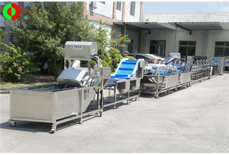 大型蔬果分選清洗-風(fēng)干包裝加工生產(chǎn)線主要由預(yù)洗提升機(jī)-多工位分選臺(tái)-無損洗菜機(jī)-風(fēng)干線-枕式包裝線-金屬探測(cè)儀等設(shè)備組成蔬果深加工處理生產(chǎn)線。